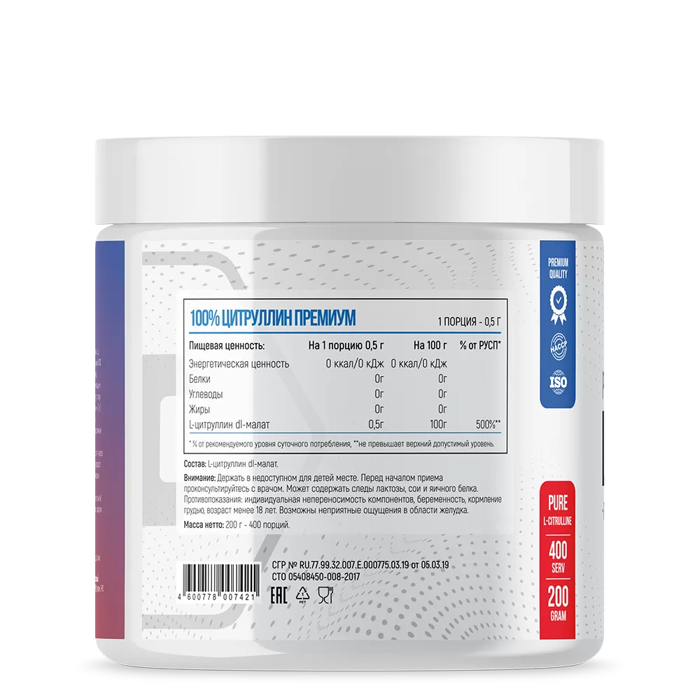 Высококачественная спортивная добавка L-Citrulline 100% premium разработана для тех, кто хочет увеличить продуктивность своих тренировок, не подвергая организм перегрузкам. Продукт стимулирует естественную выработку оксида азота, что в свою очередь, улучшает приток питательных веществ к мышцам. Регулярное употребление цитрулина позволяет прочувствовать эффект пампинга, увеличить анаэробную выносливость, снизить ощущения от утомления, а также укрепить иммунитет.