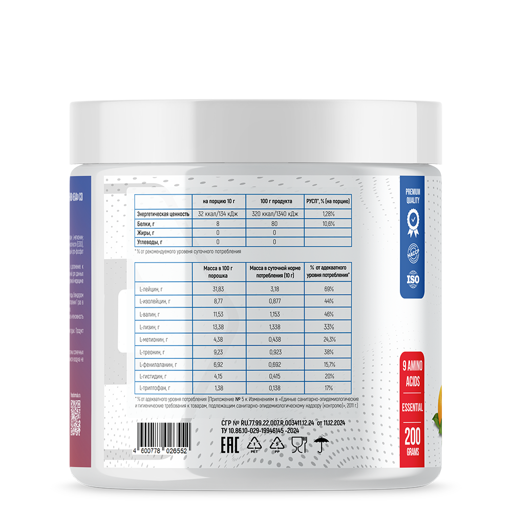 - Полный спектр EAA - 9 незаменимых аминокислот в оптимальном соотношении для быстрого усвоения.