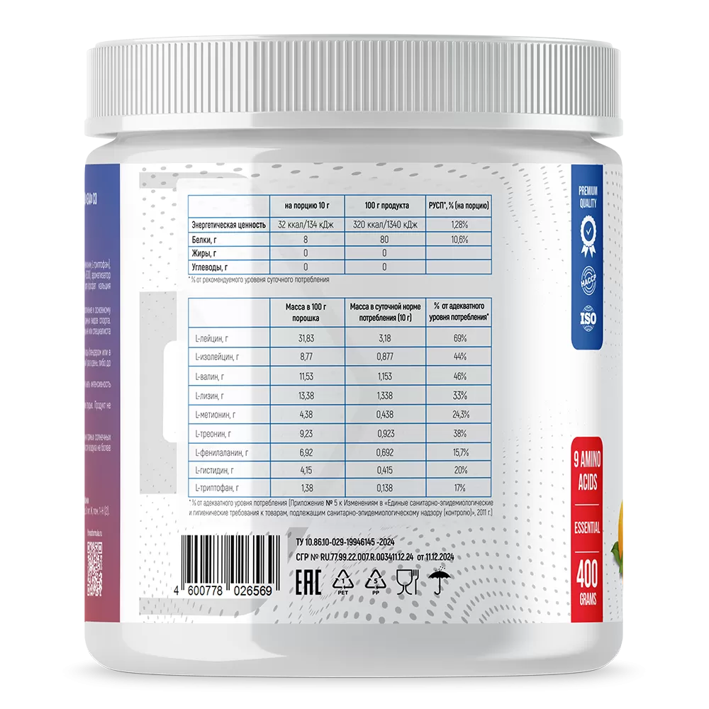 - Полный спектр EAA - 9 незаменимых аминокислот в оптимальном соотношении для быстрого усвоения.