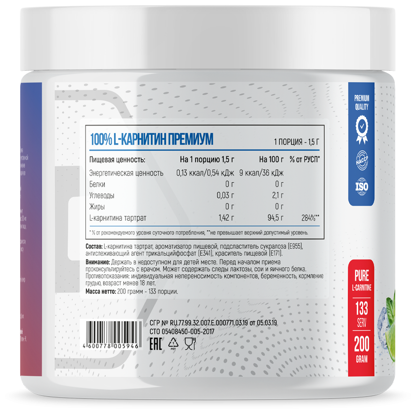 Дополнительными компонентами являются: лимонная кислота, ароматизатор, подсластитель (сукралоза), натуральный краситель, антислеживатель. Упаковка продукта содержит 133 порции. Рекомендуемая дозировка ‒ 1 порция за 15-20 минут до тренировки. Продолжительность приема составляет 2-4 недели.
