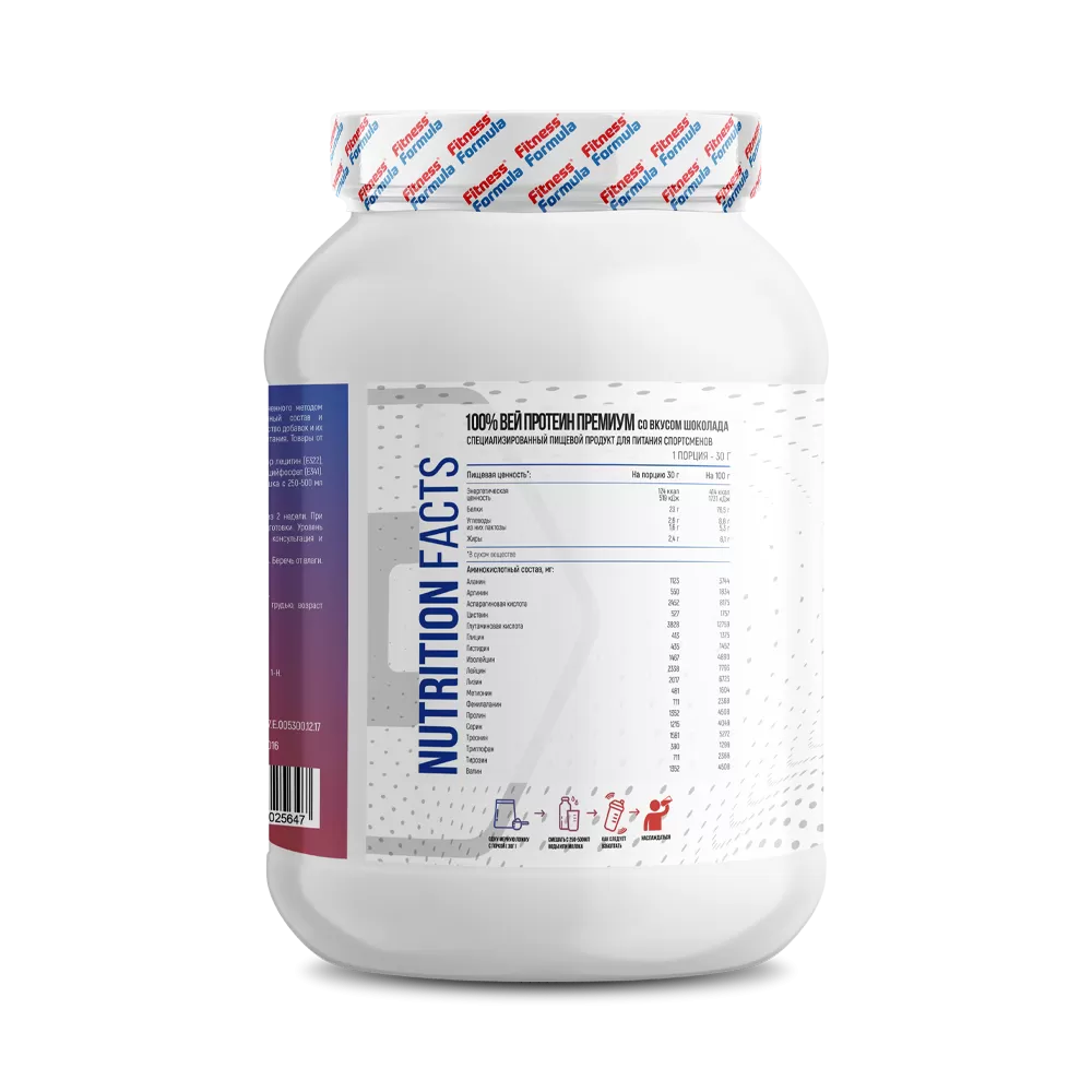 Порция спортивной добавки содержит 70-80% белка, а лактозы менее 1 гр. Низкое содержание жиров и углеводов позволяет употреблять протеин во время похудения. Натуральные ароматизаторы и подсластители обеспечивают приятное послевкусие. Порошок растворяется в воде без комочков. Fitness Formula 100% Whey Protein Premium предназначен для спортсменов и людей, ведущих активный образ жизни и испытывающих недостаток белка в ежедневном рационе. Для приготовления протеинового коктейля необходимо одну мерную ложку порошка (30 гр) смешать с 250-500 мл воды или нежирного молока.