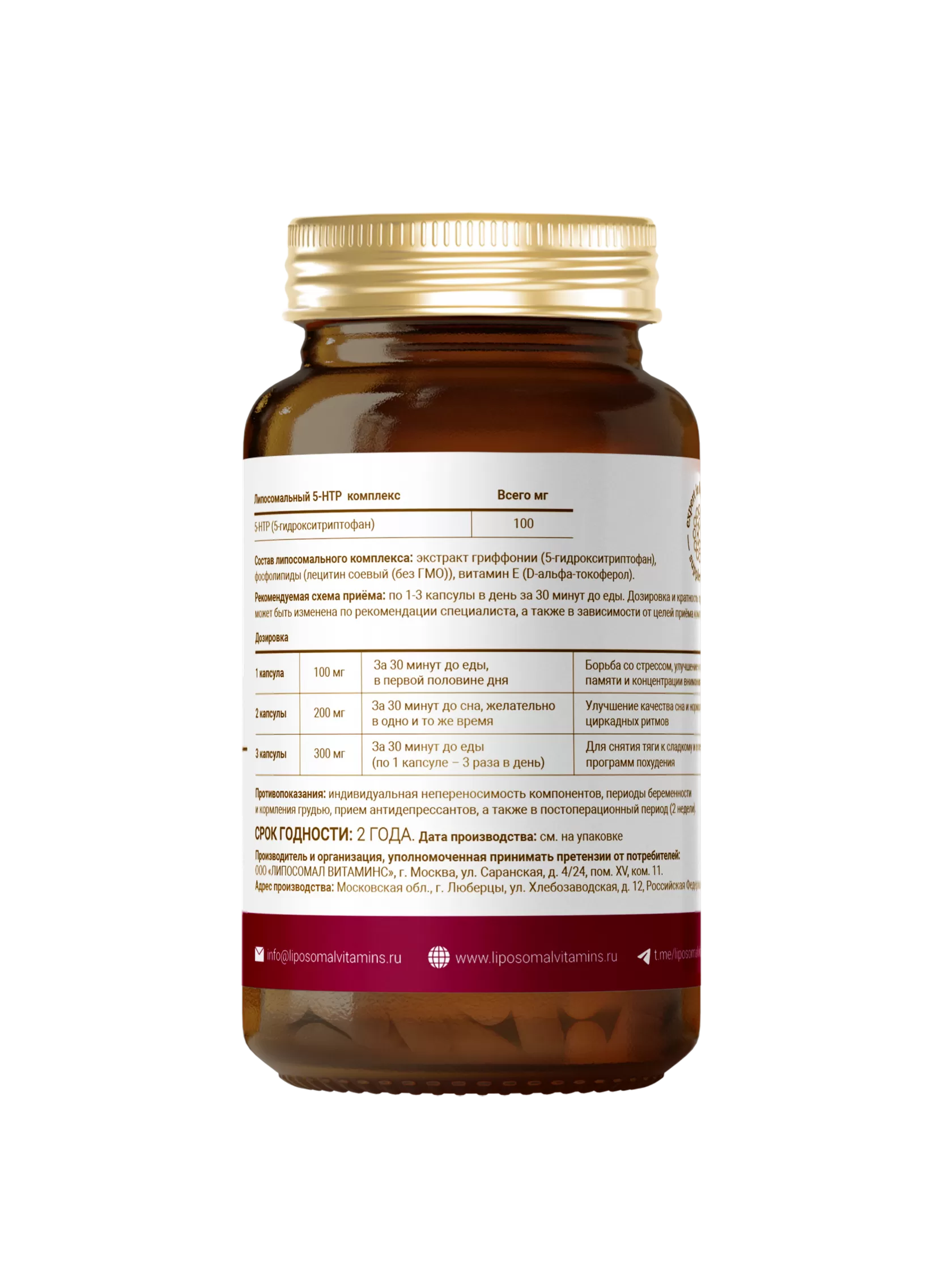 липосомального комплекса: экстракт гриффонии (5-гидрокситриптофан), натуральный соевый лецитин (без ГМО), витамин Е (D-альфа-токоферол)