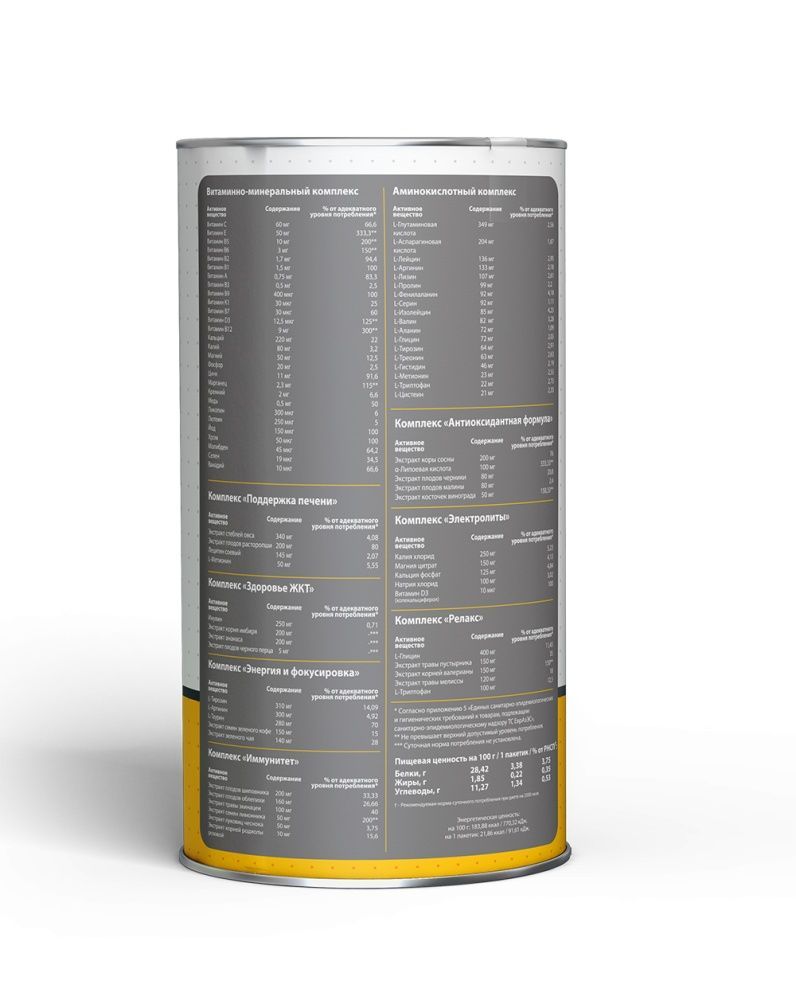 Комплекс «Энергия и фокус» (таблетка красного цвета): L-тирозин, L-аргинин, L-таурин, экстракт семян зеленого кофе, экстракт зеленого чая, наполнители - микрокристаллическая целлюлоза, крахмал; разрыхлитель – тальк; антислеживающие агенты - стеариновая кислота, диоксид кремния.