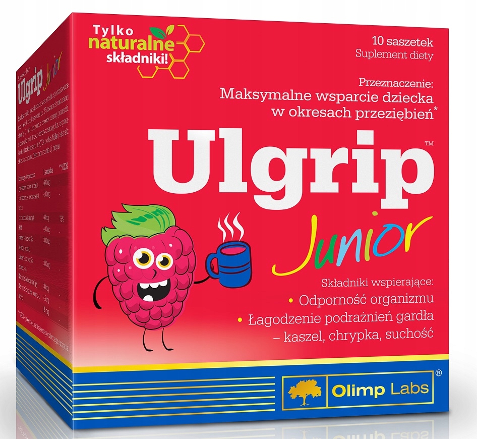 Olimp Ulgrip Junior имеет специальные ингредиенты, которые повышают иммунную систему всего организма. Это незаменимое средство во время простудных заболеваний. Добавка создана со всеми особенностями детского организма. Порошок обладает вкусом малины. Его нужно применять для приготовления теплого напитка.
