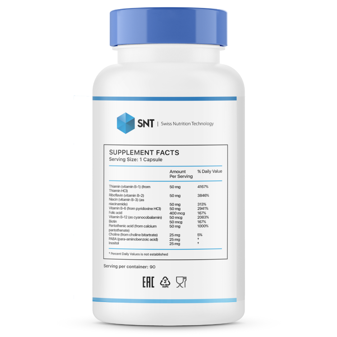SNT B-50 — сбалансированный комплекс, в который входит 11 витаминов группы В. Эти компоненты необходимы для правильной работы ЦНС, поддержания метаболизма, кроветворения и сохранения хорошего самочувствия. Добавка содержит профилактическое количество витаминов, за счет продуманной формулы она легко усваивается и крайне редко вызывает побочные эффекты. Продукт сертифицирован по GMP, что подтверждает высокое качество компонентов.