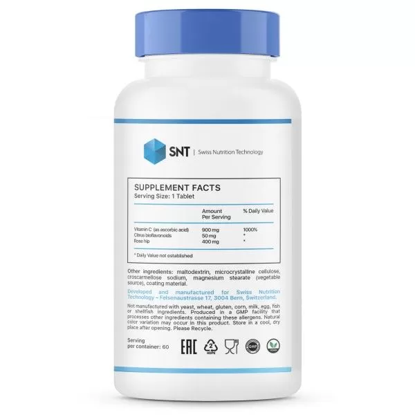 SNT Vitamin C-900 (120 табл) содержит витамин C (форма аскорбат кальция). Он укрепляет иммунитет, кости, кровеносные сосуды и делает кожу упругой. Аскорбат кальция не раздражает слизистую оболочку желудка.