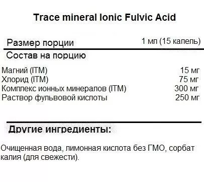 Trace Ionic Fulvic Acid 250 mg (59 мл) ‒ концентрат фульвокислоты с ионными минералами. Продукт предназначен для поддержки энергии, пищеварения и гидратации, особенно для людей с дефицитом минералов. Добавка сертифицирована и рассчитана для ежедневного употребления.