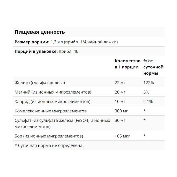 Trace Ionic Iron рекомендован для людей с анемией, низким ферритином, вегетарианцев или женщин с обильными менструациями. Суточная норма ‒ 1.2 мл (¼ ч.л. ≈ 24 капли). Жидкость нужно разбавить в 200-300 мл воды или сока.
