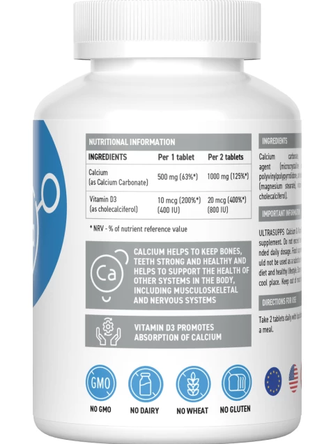 Комплекс Ultrasupps Calcium & Vitamin D3, где кальций представлен в биодоступной форме карбоната в сочетании с важнейшим витамином D3, хорошо усваивается организмом. Синергия кальция и витамина D3 увеличивают положительный эффект от приёма.